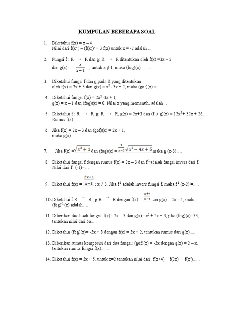 Contoh Soal Komposisi 3 Fungsi. Akan dibahas juga mulai dari pengertian fungsi koposisi beserta rumus dan contoh soal. Kumpulan contoh soal fungsi yang diberikan di sini sesuai untuk level kognitif aplikasi.