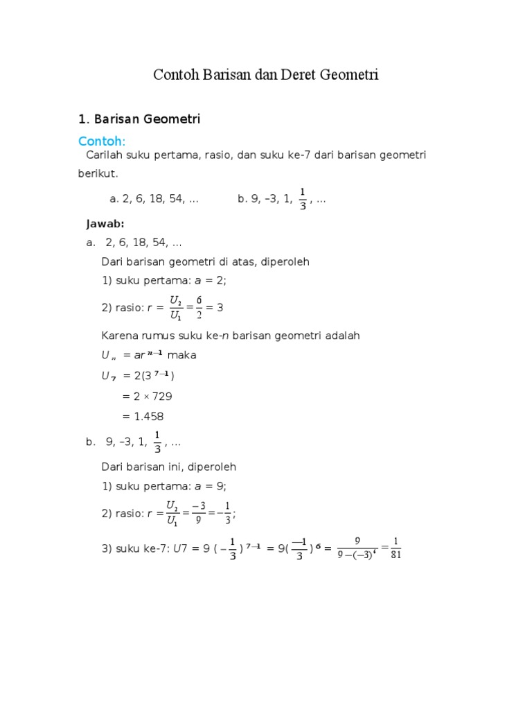 Secara umum Deret geometri merupakan penjumlahan suku-suku dari suatu barisan geometri. Sekian penjabaran artikel diatas tentang Deret Geometri - Rumus, Contoh Soal, Tak. Barisan geometri adalah baris yang nilai setiap sukunya didapatkan dari suku sebelumnya melalui perkalian dengan suatu.