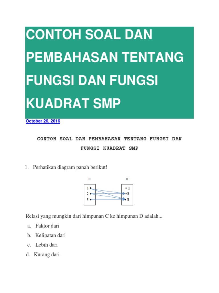 Contoh Soal Fungsi Kuadrat Smp. Contoh Soal Fungsi - Matematika merupakan pelajaran yang sangat menarik dan mengasyikan untuk dapat mengasah daya berpikii otak kita. Umumnya, materi ini dipelajari setelah siswa memahami konsep mengenai persamaan kuadrat, karena selain melibatkan perhitungan secara aljabar, materi ini juga melibatkan analisis secara geometri.