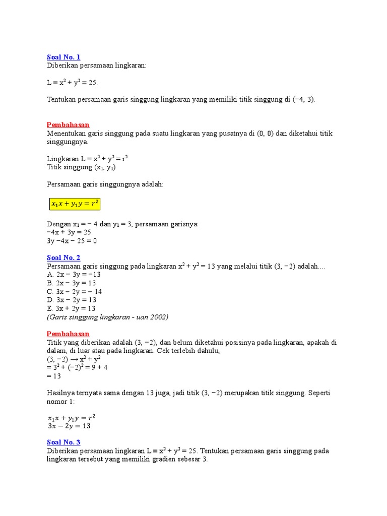 Persamaan Garis Singgung Lingkaran dan Contoh Soal Garis ...